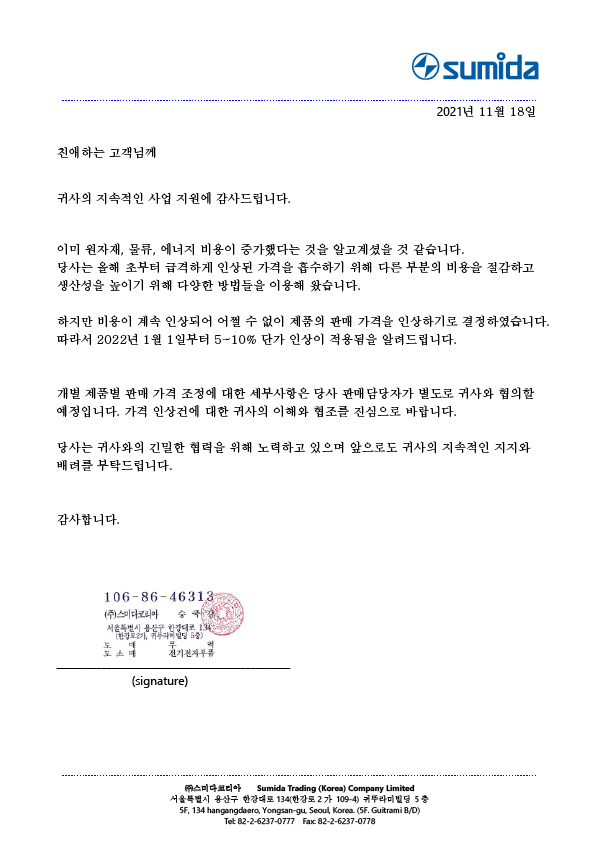SUMIDA 2022³â 1¿ù 1ÀϺÎÅÍ Àü Á¦Ç° ´Ü°¡ Àλó ¾È³»